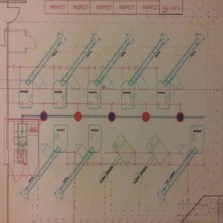 To get the oil to and from the grinders involved designing and building a centralized oil supply and dirty return pipe between the two rows of machines. Each machine tapped into this shared drain line.