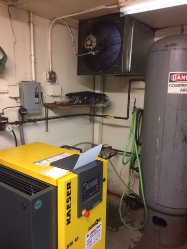 The grinders needed compressed air, but air compressors create a large amount of heat which was a problem for the air controlled room. The solution was to build a room around the compressor area. We ended up with a bonus spare parts storage unit above it.