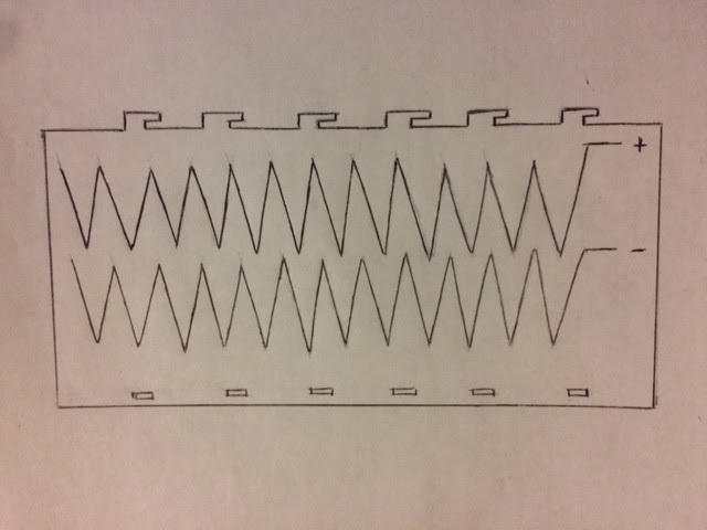 Step one: Print conductive parallel zigzag ink circuits on plastic film and punch mechanical interlock tabs in opposed long edges of sheet.