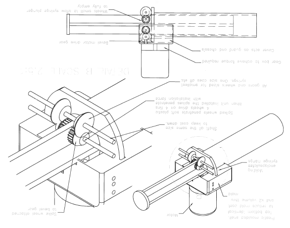 Syringe snaps vertically into motor drive pinion gear. Red button ejects syringe. Foot pedal would activate motor.