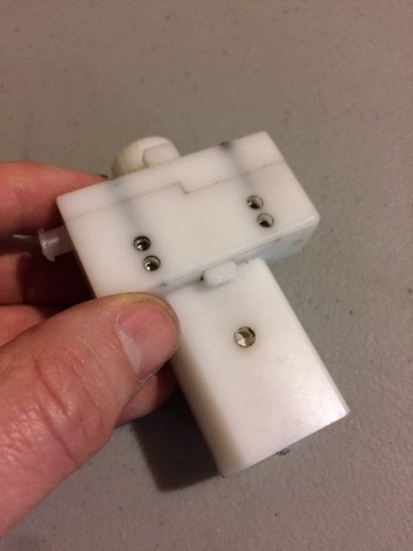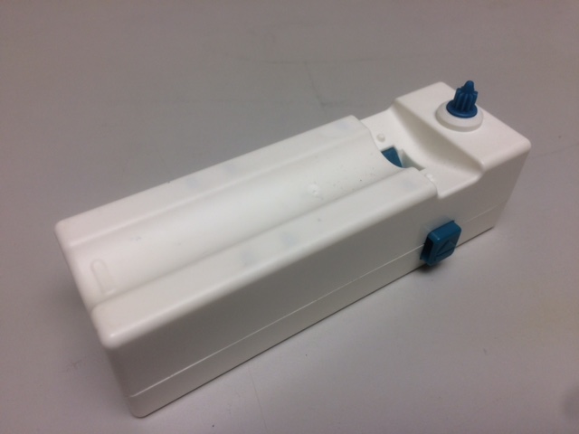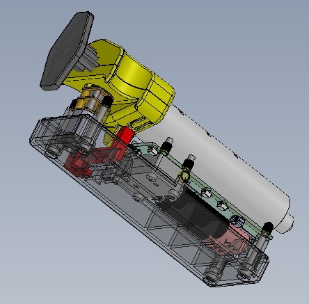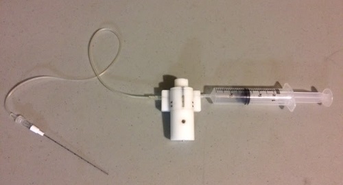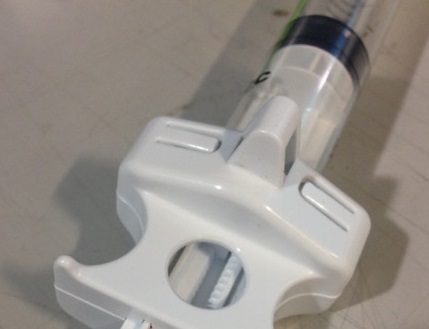 Prototype has proposed vertical sliding wedge to allow manual syringe mod. Fingers can shuttle the wedge up or down by pressing on the exposed end of wedge.