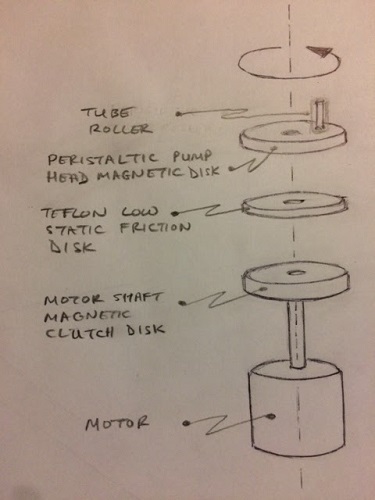 Fluid pressure would be controlled by a pair of teflon coated magnetic clutch plates to limit the maximum allowed motor shaft torque to be transferred to the tube roller cartridge. At the maximum allowable fluid pressure, the roller rotation would stop as the clutch slips.