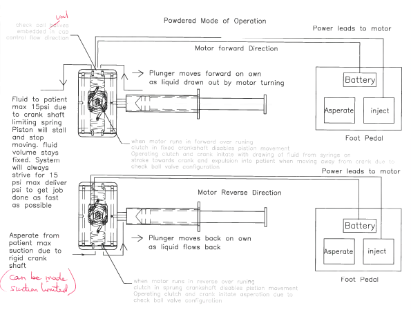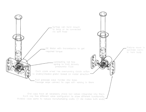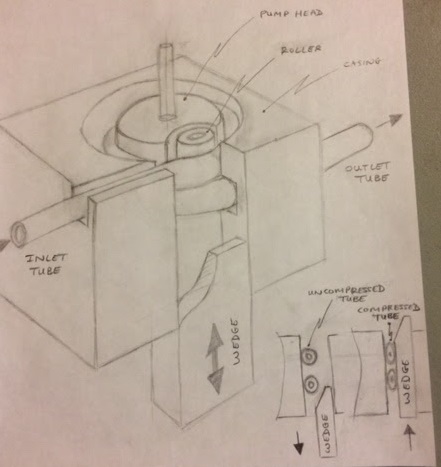 A modified, small peristaltic pump was a strong concept contender too. The pump would suck the fluid out of any size syringe by creating a vacuum in the tube behind the roller and then pushing it through the tube needle set to the patient. Foot pedal would control the pump.